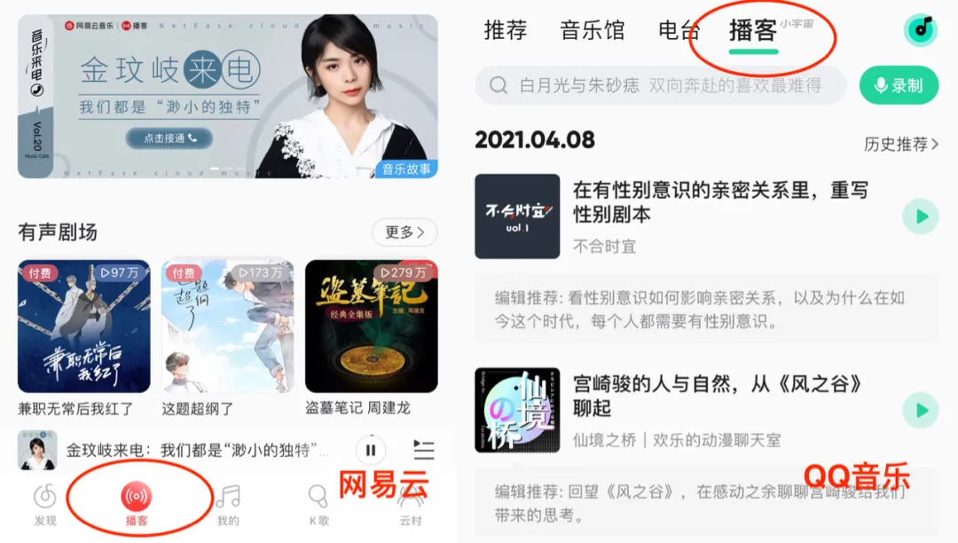 大概从去年下半年,网易云音乐和腾讯的QQ音乐陆续上线播客专区。由于上线时间不长,目前社区人气显然不如那些小姐姐直播唱歌的场景,甚至逊于一些二次元直播间。因为在这些实时场景中,听众可以通过弹幕、聊天室的图文、虚拟礼物等形式进行互动,还是视频直播那一套逻辑。或许说明,国内用户在互动性、参与感、表达欲方面更强烈,偏知识类的、提前录制好的播客内容可能消费门槛还是高了。所以近期才会出现一批巨头+创业公司模仿Clubhouse做音频社交的现象。
