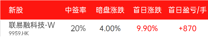 联易融(09959.HK)本周五登陆港交所大涨9.9%,打破港股IPO长达一个月的破发潮,股价高开9.9%报19.32元,尾市最高涨至19.98元,全日收涨9.9%,不计手续费,每手500股,账面赚870元。 乙组打新最少中签15手,账面赚1.3万港元。