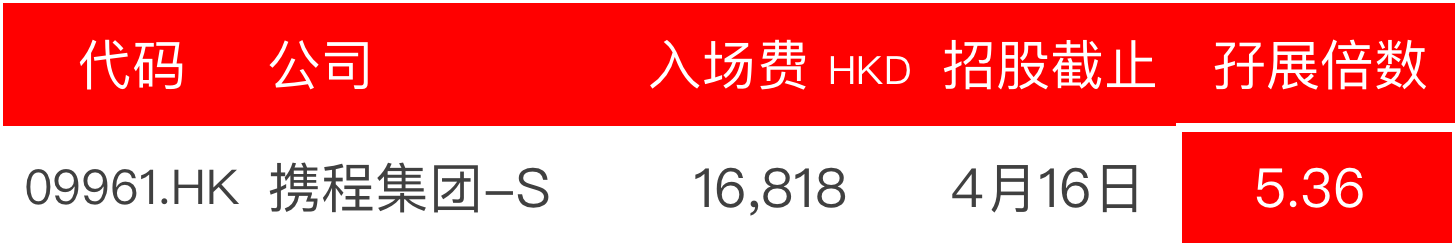 携程的招股期至下周二(13日)结束,预计19日上市,最高发售价为每股333元,集资最多105.3亿元,每手50股入场费约16,817.78元。