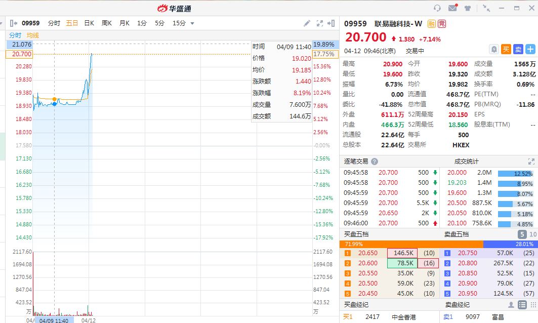 联易融科技-W(09959.HK)高开高走,目前涨7.14%,股价报20.7港元,较发行价涨超17%,成交3.128亿港元,市值468.7亿港元