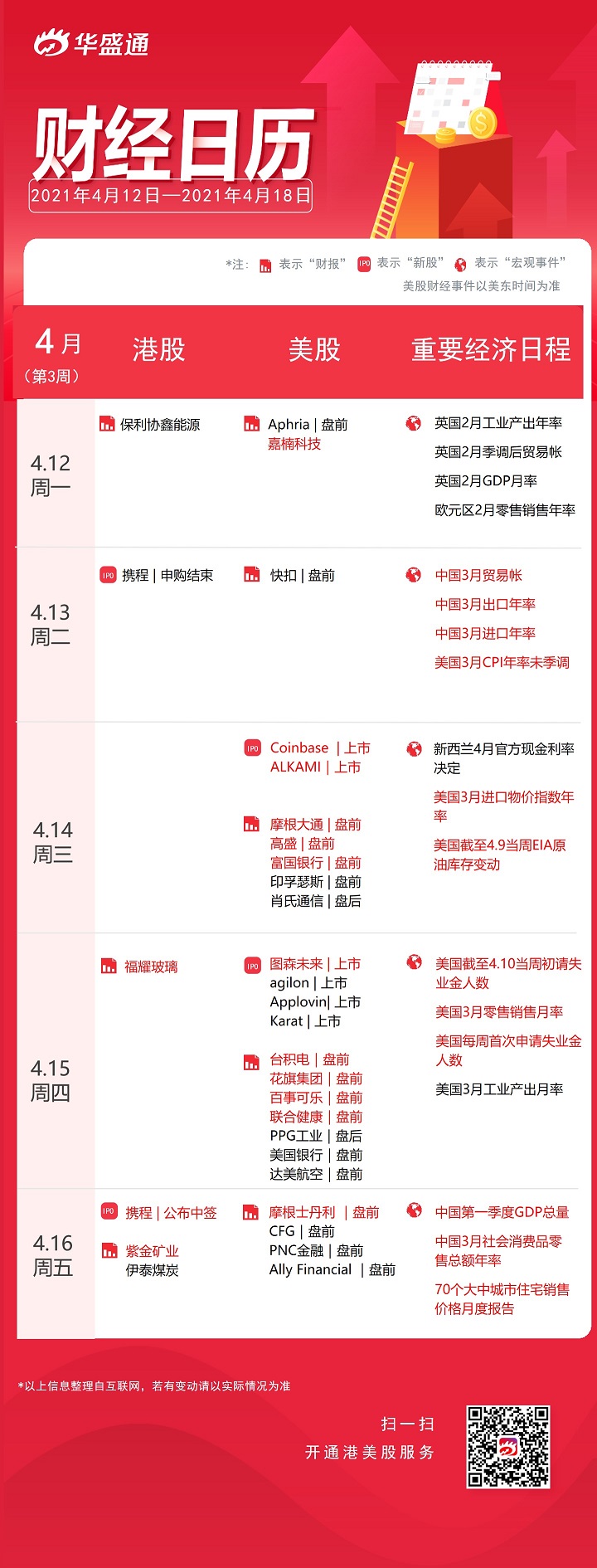 财报方面,港股可关注保利协鑫能源和福耀玻璃等重点财报;此外,美股将迎来Q1重磅财报,可重点关注嘉楠科技、摩根大通、高盛、花旗集团、台积电等重点财报。