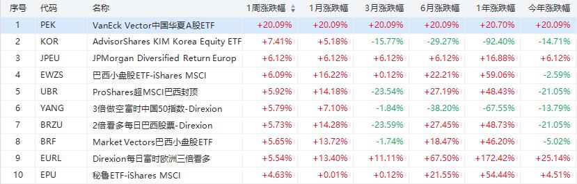 区域ETF方面,上周新兴市场股市分化。其中,3倍做空富时中国50指数YANG一周涨近6%;2倍看多每日巴西股票的BRZU一周涨近6%。