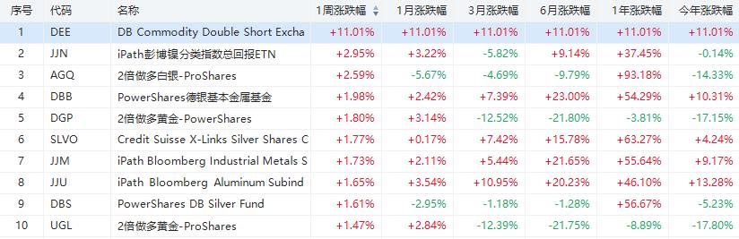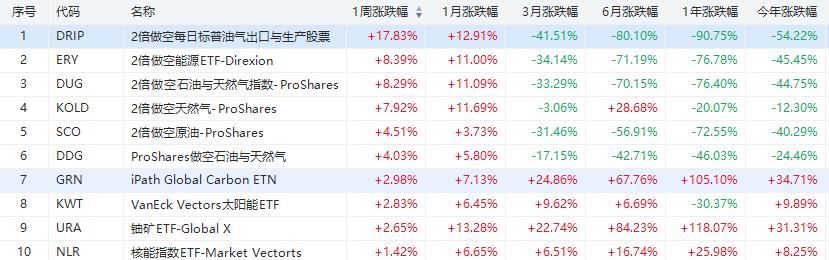 在诸多利空因素下,油价恢复跌势。其中2倍做空标普油气出口与生产股票的DRIP一周涨近18%,系上周表现最佳的能源ETF;另外2倍做空能源的ERY一周涨超8%。