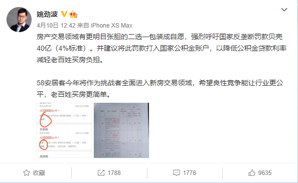 在传出阿里因为强制“二选一”的垄断行为而被巨额罚款之后,58同城的CEO姚劲波于4月10日在其微博上发文蹭了一波热度:在房产交易领域有更名目张胆的二选一却包装成自愿的情况。并晒出了相关的证据,呼吁国家对贝壳找房罚款40亿元人民币。姚劲波抓住阿里被罚的关头精确打击贝壳,不可不谓“蓄谋已久”。