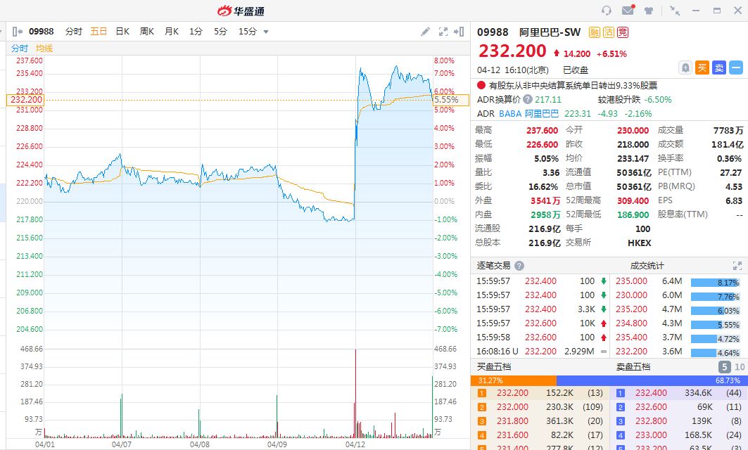 阿里巴巴涉嫌垄断被巨额罚款基本上已经尘埃落定,今日阿里巴巴港股高开高走,涨幅一度高达8%,市值重回5万亿港元大关上方。