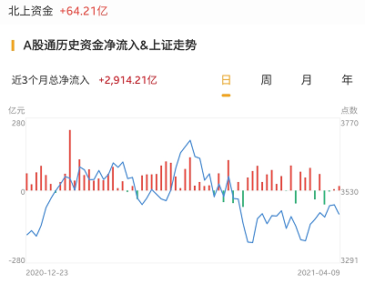 北上资金今日净流入64.21亿元,上周五为净流入超16亿元。