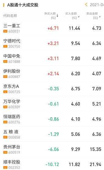 北上资金今日净买入三一重工6.71亿元,为今日买入之最。其次,净买入宁德时代3.21亿元。