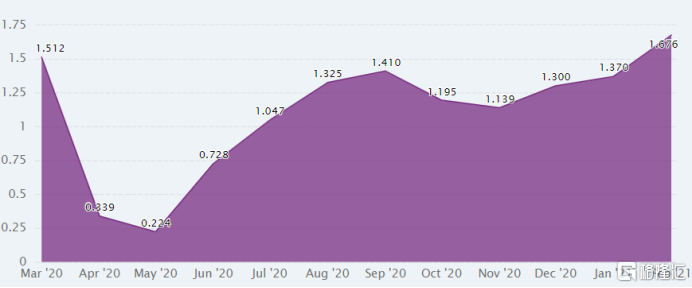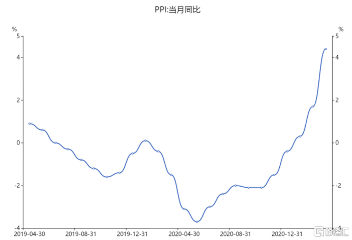 2021年2月份,美国的通货膨胀率为1.7%。拜登2.25万亿美元的基建法案落地,而3月份的PPI数据超预期大涨,更加深了市场对通胀的预期。
