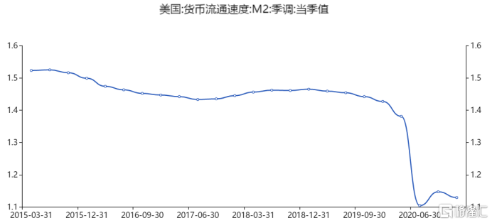 而截至2021年一季度,美国的货币发行量较2019年市场正常状态以前增加了4.5倍,但是货币流通速度却下降了20%,已降至大萧条以来最低水平。央行超发的货币实际上没有被有效利用,而是大量地以闲置形式被存储或者流入股市,这是美国通胀率迟迟没能达到2%的一大原因。