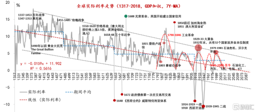 如果说历史上的利率下行反应的是商品货币制度下人类社会从野蛮到文明,从战争到和平的演进。那么,近百年来的利率下行则表现的是信用货币制度和全球化背景下人口、财富分配和科学技术等因素的合力。
