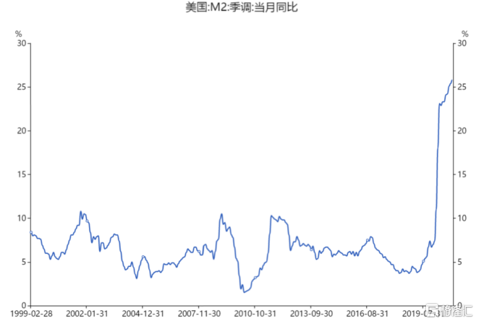 2020年疫情期间美联储扩表超过3万亿美元,堪称史诗级放水,M2增速高达25%,超过千禧年以来的任何时候。