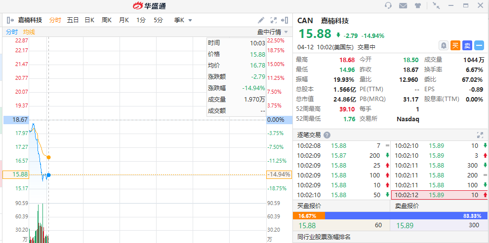 华盛资讯4月12日讯,美股盘初,嘉楠科技走低。截至发稿,该股大跌近15%,股价报15.88美元。