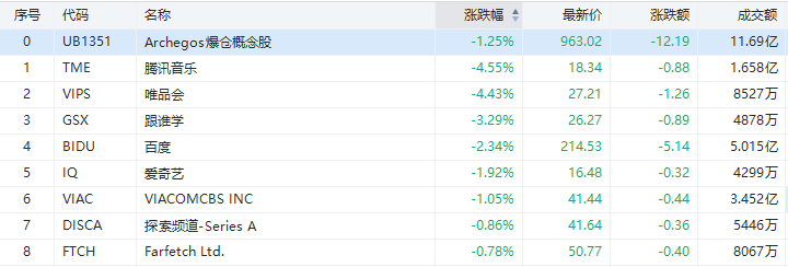 华盛资讯4月12日讯,Archegos爆仓风波相关股票今日下挫,腾讯音乐跌近5%,唯品会跌超4%,跟谁学跌超3%,百度跌超2%,爱奇艺跌1.92%。