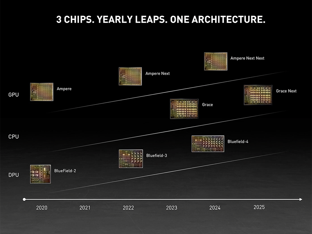 去年NVIDIA重磅发布旗舰A100 GPU以及一系列服务器、集群、超算,轰动整个人工智能领域,如今,老黄带着一系列软硬件新品高调回归。万万没想到,这一次,全球GPU霸主NVIDIA推出了一款基于Arm的数据中心CPU!在宣布400亿美元收购Arm的6个月后,NVIDIA连发三款基于Arm IP打造的处理器,包括全球首款专为TB级加速计算而设计的CPU NVIDIA Grace、全新BlueField-3 DPU,以及业界首款1000TOPS算力的自动驾驶汽车SoC。“我们每年都会发布激动人心的新品。三类芯片,逐年飞跃,一个架构。”黄仁勋说,数据中心路线图包括CPU、GPU和DPU这三类芯片,而Grace和BlueField是其中必不可少的关键组成部分。每个芯片架构历经两年的打磨周期(周期内可能出现转变),一年专注于x86平台,另一年专注于 Arm 平台。
