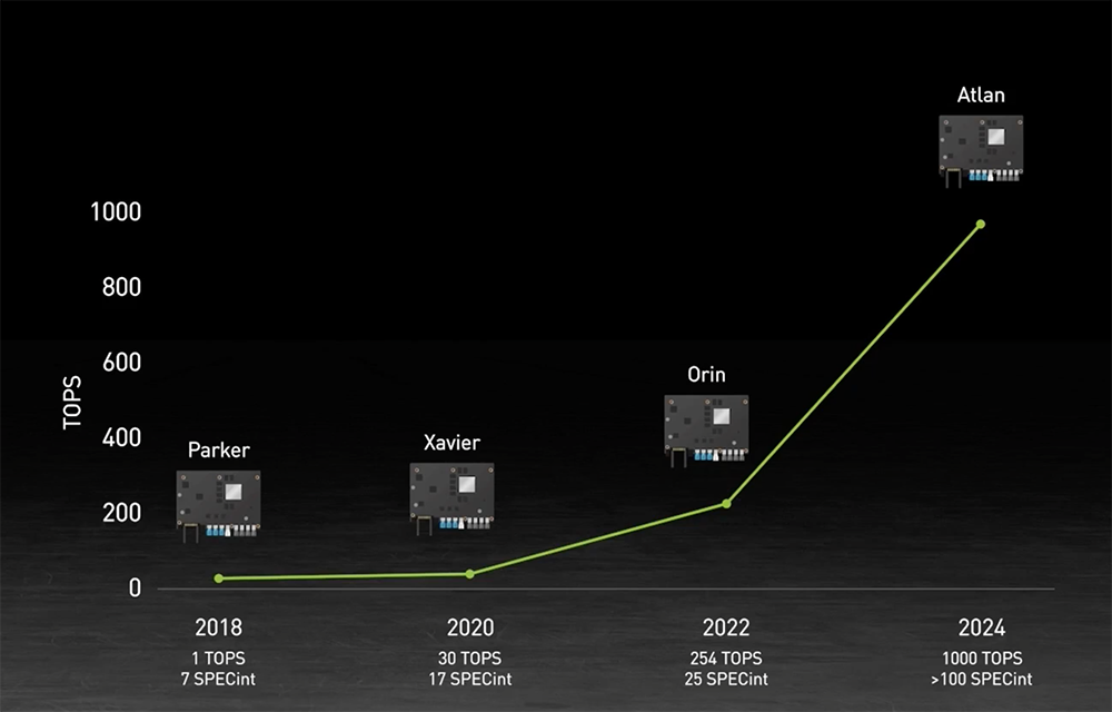 3、车轮上的数据中心:算力达1000TOPSNVIDIA DRIVE Atlan是新一代AI自动驾驶汽车处理器,算力将达到1000TOPS,约是上一代Orin处理器的4倍,超过了绝大多数现有无人驾驶出租车的子女计算能力。
