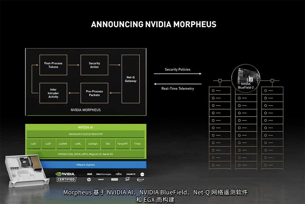 4、Morpheus:AI网络安全应用框架为了保障现代化数据中心的安全,黄仁勋宣布推出基于NVIDIA GPU、BlueField DPU、Net-Q网络遥测软件和EGX的新型AI框架而构建的NVIDIA Morpheus数据中心安全平台,能够对完整的数据包进行实时检测、预防安全威胁,现可抢先试用。作为一个基于AI的云原生网络安全框架,NVIDIA Morpheus通过在边缘和AI技术的结合,利用实时的遥测、策略执行及操作,可以在不牺牲成本和性能的情况下分析更多的安全数据,识别、捕捉和应对以往无法识别的威胁和异常情况,如未加密敏感数据的泄露、网络钓鱼攻击和恶意软件。