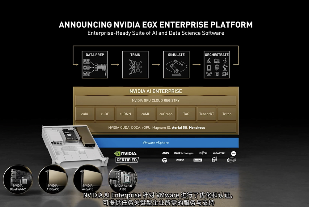 NVIDIA在去年推出了一个机架比肩AI数据中心的AI系统DGX A100、AI算力高达700 PFLOPS的集群DGX SuperPOD、千万亿级工作组服务器DGX Station A100。面向AI应用需求,NVIDIA已经提供Megatron、Jarvis、Merlin、Maxine、Isaac、Metropolis、Clara和DRIVE、以及各种可使用TAO进行定制化的预训练模型。今天,NVIDIA进一步强化企业计算服务,不仅推出大型语言模型训练与推理问答引擎、宣布对话式AI平台最新落地进展,还展示了其量子电路模拟框架。1、NVIDIA EGX:扩大认证服务器生态系统为进一步实现AI民主化,黄仁勋发布了来自顶尖制造商的新系列NVIDIA认证系统,即大容量企业级服务器,现已通过认证。这一系统可运行NVIDIA AI Enterprise软件套件,该套件得到了全球应用最广泛的计算虚拟化平台——VMware vSphere 7的独家认证。