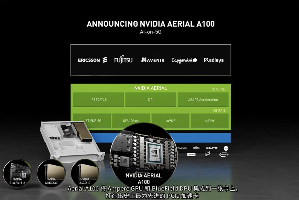 5、Aerial A100:5G+AI的新型边缘计算平台黄仁勋还提到了NVIDIA的AI-on-5G计算平台,这是一款专为边缘设计、将5G和AI相结合的新型计算平台。该平台将采用NVIDIA Aerial软件开发套件与NVIDIA BlueField-2 A100,将GPU和CPU组合成“有史以来最先进的PCIE卡。”富士通、谷歌云、Mavenir、Radisys和Wind River等合作伙伴都在开发适用于NVIDIA AI-on-5G平台的解决方案。
