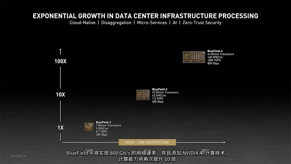 BlueField-3通过NVIDIA DOCA(集数据中心于芯片的架构)软件开发包为开发者提供一个完整、开放的软件平台,开发在BlueField DPU上开发软件定义和硬件加速的网络、存储、安全和管理等应用。DOCA已于今日发布并提供下载。新一代BlueField-3 DPU预计将于2022年第一季度发布样品,第四代BlueFieldDPU将包含640个晶体管,算力达1000TOPS,网络速率达800Gbps。