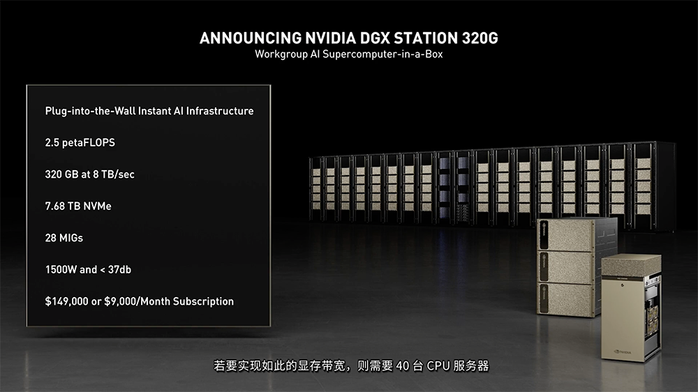 黄仁勋夸赞说:“Atlan集NVIDIA在AI、汽车、机器人、安全和BlueField安全数据中心领域的所有技术之大成,堪称一项技术奇迹。”4、便捷式AI数据中心和DGX SuperPod双升级黄仁勋还宣布升级NVIDIA专为工作组打造的“便携式AI数据中心”NVIDIA DGX Station,以及NVIDIA专为密集型AI研发打造的AI数据中心产品NVIDIA DGX SuperPod。全新DGX Station 320G借助320GB超快速HBM2e连接至4个NVIDIA A100 GPU,内存带宽达到每秒8TB。然而,仅需将其插入普通的壁装电源插座即可使用,耗电量只有1500W。黄仁勋说,达到这种性能的CPU集群成本约为100万美元,而DGX Station仅需14.9万美元。