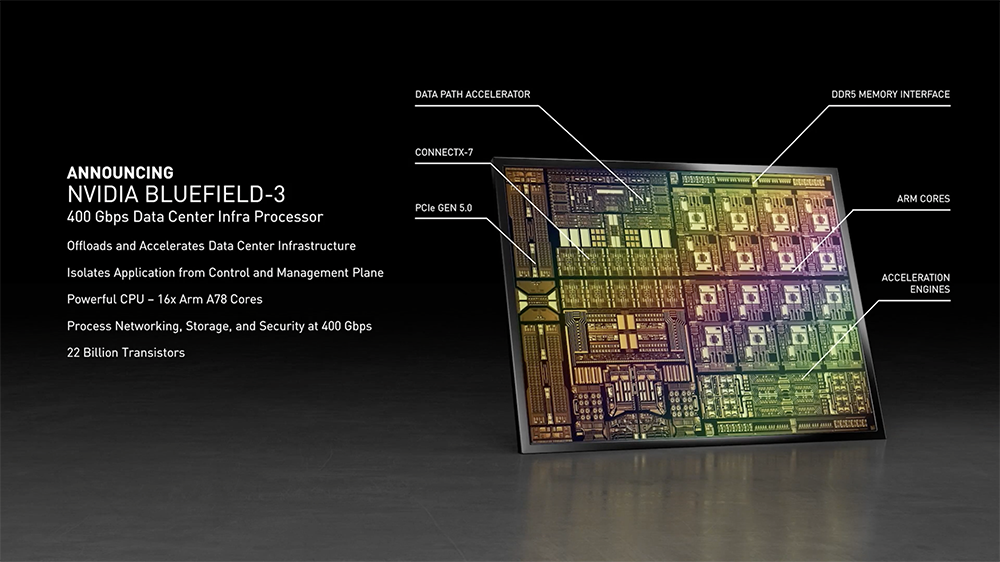NVIDIA Grace以发明了世界上第一个编译器、被称为“计算机软件工程第一夫人”的先驱计算机科学家Grace Hopper命名,具体有3点创新进步:(1)内置下一代Arm Neoverse内核,每个CPU能在SPECrate2017_int_base基准测试中单位时间运行超过300个实例;(2)采用第四代NVIDIA NVLink,从CPU到GPU连接速度超过900GB/s,达到相当于目前服务器14倍的带宽;从CPU到CPU的速度超过600GB/s。(3)拥有最高的内存带宽,采用的新内存LPDDR5x技术,带宽是LPDDR4的两倍,能源效率提高了10倍,能提供更多计算能力。明年将有两台性能强大的AI超级计算机面世,都将采用NVIDIA Grace,据称其与NVIDIA GPU紧密结合,性能将比目前最先进的NVIDIA DGX系统(在x86 CPU上运行)高出10倍。这两台AI超算中,瑞士国家计算中心(CSCS)正在打造一个算力可达20Exaflops的系统,美国洛斯阿拉莫斯国家实验室(Los Alamos National Laboratory)也将为其研究人员配备新AI超算。2、Bluefield-3 DPU:220亿晶体管在黄仁勋看来,负责在数据中心传输和处理数据的数据处理单元(DPU),正与CPU、GPU共同组成“未来计算的三大支柱”。NVIDIA全新BlueField-3 DPU包含220亿个晶体管,采用16个Arm A78 CPU核心、18M IOPs弹性块存储,加密速度是上一代的4倍,并完全向下兼容BlueField-2。BlueField-2能够卸载相当于30个CPU核的工作负载,而BlueField-3实现了10倍的加速计算性能提升,能够替代300个CPU核,以400Gbps的速率,对网络流量进行保护、卸载和加速。该处理器也是首款支持第五代PCIe总线并提供数据中心时间同步加速的DPU。
