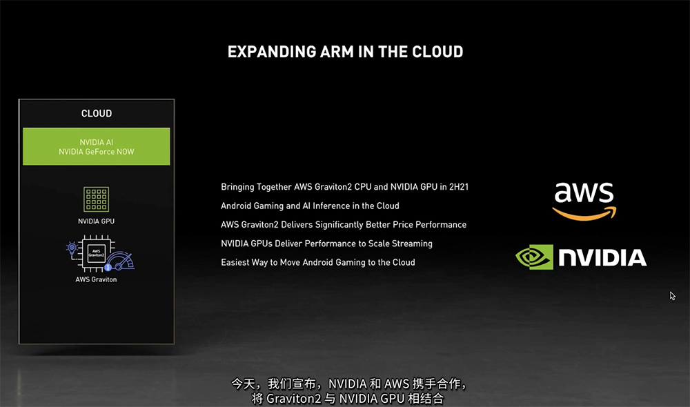 除了推出基于Arm的CPU外,NVIDIA还宣布一系列与Arm处理器设计商的合作进展,包括将为亚马逊AWSGraviton2 CPU提供GPU加速、为科学和AI应用开发提供支持的全新HPC开发者套件、提升边缘视频分析和安全功能、打造新一类基于Arm并搭载NVIDIA RTX GPU的新款PC等。这些举动反映出无论是市场还是NVIDIA自身,对基于Arm的解决方案的兴趣已经超出移动领域。1、NVIDIA GPU搭配亚马逊自研CPU赋能云服务2021年下半年,基于亚马逊云科学(AWS)自研服务器处理器AWS Graviton2的Amazon EC2实例将与NVIDIA GPU相结合,在云端部署。这一新组合将实现降低成本、支持更丰富的游戏串流体验、优化云上安卓游戏和人工智能推理、以更低成本提供更高的AI推理性能等优势。黄仁勋说:“我们致力于将Arm生态系统扩展到移动和嵌入式系统以外的市场,而今日宣布的新合作伙伴,正是我们迈出的第一步。”