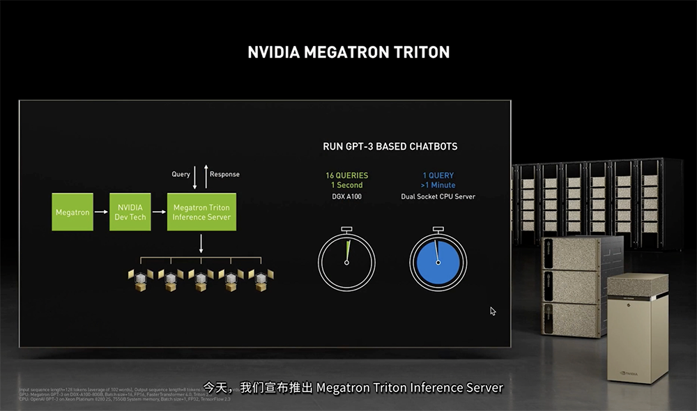使用Megatron Triton的DGX A100能在1秒内做出响应,可同时支持16项查询,而双插座CPU服务器支持1条问询就超过了1分钟。