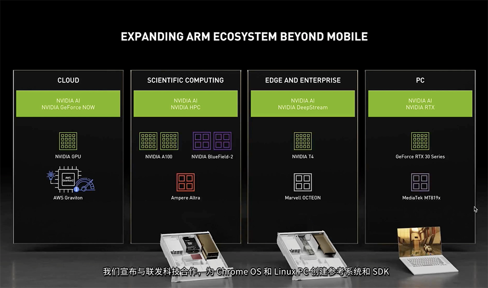 3、加速边缘安全功能,打造由GPU驱动的新PC今天NVIDIA还宣布了提升边缘视频分析和安全功能、打造新一类基于Arm并搭载NVIDIA RTX GPU的新款PC等进展。在边缘计算领域,NVIDIA正扩大与Marvell的合作,将基于Arm的OCTEON DPU与GPU相结合,加速AI工作负载,实现网络优化和安全。在PC领域,NVIDIA与全球最大的基于Arm的SoC供应商之一联发科合作,共同打造一个采用Arm核与NVIDIA显卡、支持Chromium、Linux和NVIDIA SDK的参考平台,将GPU的性能及先进的AI、光线追踪图形等技术带入Arm PC平台。此外,NVIDIA也正与富士通、SiPearl等其他合作伙伴共同致力于扩展Arm生态系统。