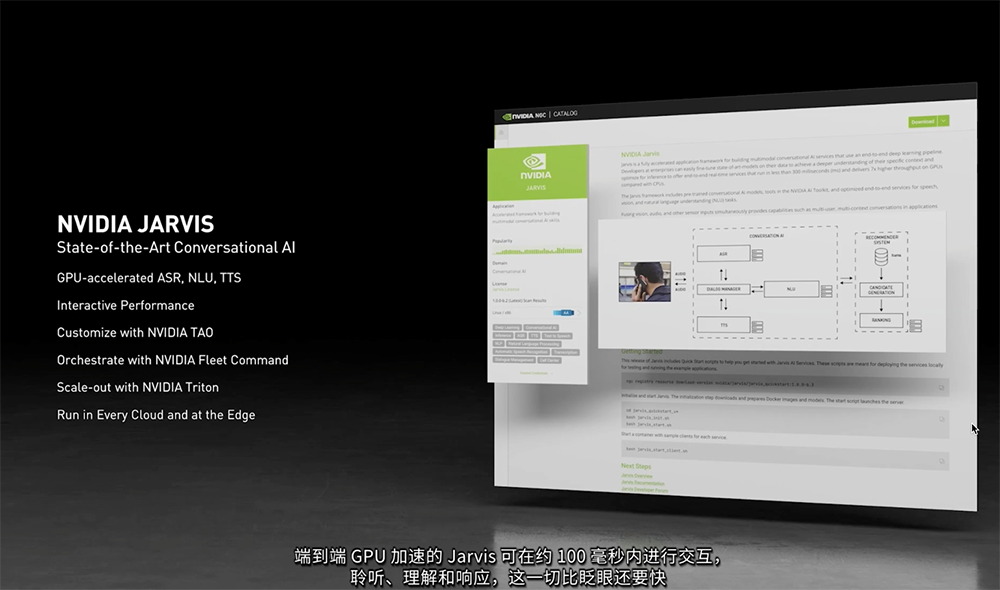 3、Jarvis:实时对话式AI平台现可使用Jarvis是一个基于NVIDIA GPU提供实时性能的灵活、多模态对话式AI服务应用框架,可帮助开发者轻松实现实时语音识别、转录、摘要、翻译、封闭式字幕、虚拟助手、聊天机器人等功能。现在,NVIDIA已经是一个生产就绪、现已可用的端到端对话式AI模型,企业可基于自身数据和特定需求对模型做进一步的微调,并使用NGC实现在云或边缘快速部署定制化语言型AI服务。