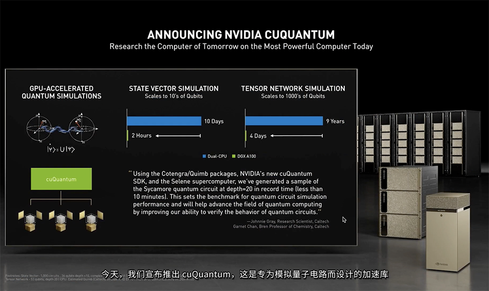 运行cuQuantum基准测试时,状态向量模拟在双CPU服务器上需要10天,但在DGX A100上只需2小时,DGX上的cuQuantum可以高效模拟10倍的量子位,从而助力研究人员设计出更完善的量子计算机。