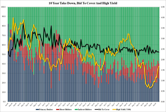 获配比例方面,美联储和其他美国联邦政府实体在内的直接购买人(direct buyers)本次获得了16.2%,创下了去年12月以来的最低值。包括外国央行在内的间接购买人(indirect buyers)本次获配比例是59.6%,比上月高出接近三个百分点,而与近期的平均水平60.0%相比几乎打平。至于负有防止流拍义务的一级交易商(Dealer)的获配则是24.2%,维持在近期的平均水平附近。