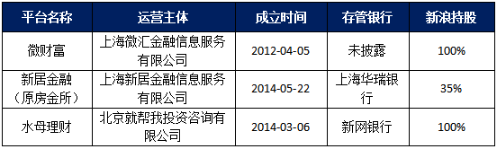 除微财富外,另外两家P2P平台——新居金融、水母理财也都在上线后受到监管政策等影响,频频更名(比如水母理财,其名称叫过水母智投、新浪易融、新浪智投等),基本处于暂停发标状态。