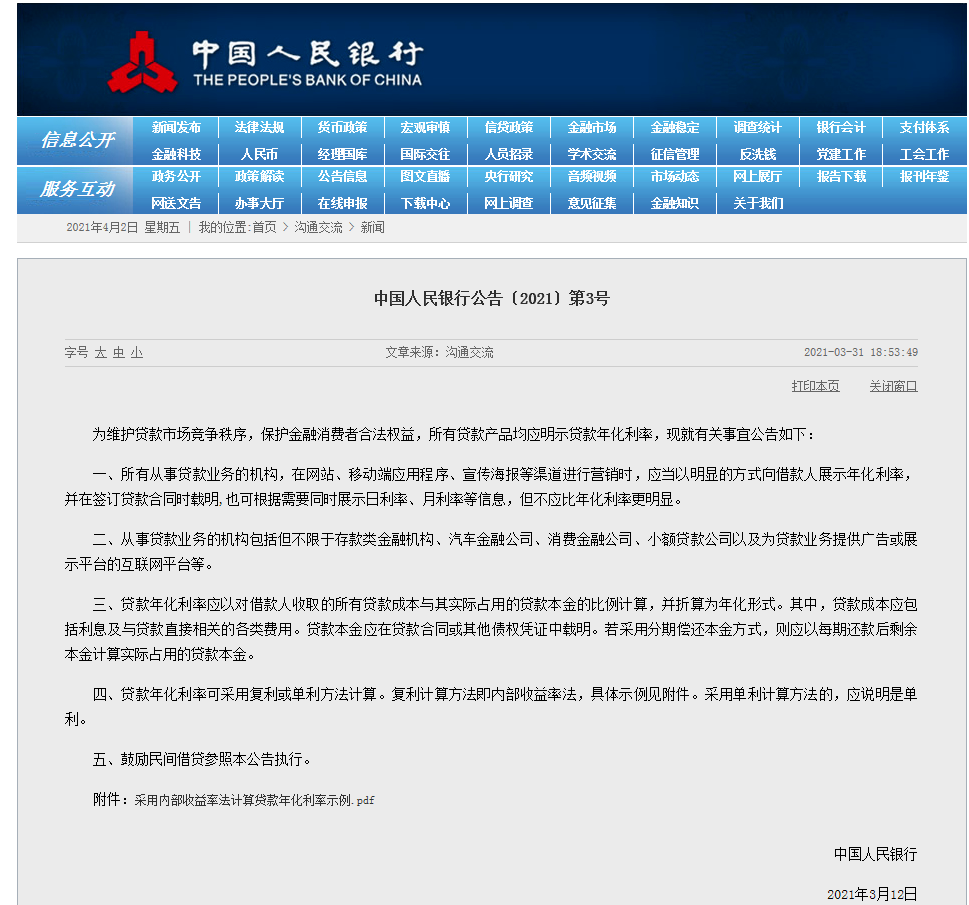 按3月12日央行公告要求,所有从事贷款业务的机构,包括消费金融公司等,在网站、移动端应用程序、宣传海报等渠道进行营销时,应当以明显的方式向借款人展示年化利率,并在签订贷款合同时载明。