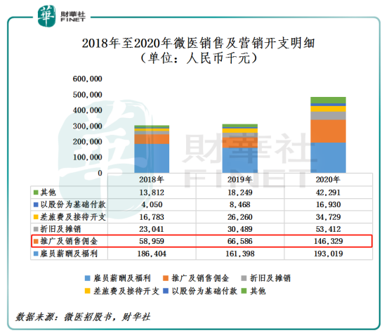 据招股书显示,2018年、2019年及2020年,销售及营销开支分别为3.03亿元、3.11亿元及4.87亿元,复合年增长率为25.14%。其中,推广及销售佣金的开支(包括与营销活动、展销及广告有关的开支)增速最快,推广及销售佣金的开支分别为5,896万元、6,658.6万元及1.46亿元,占销售及营销开支比重分别为19.5%、21.4%及30%。2018-2020年推广及销售佣金复合年增长率高达57.4%。