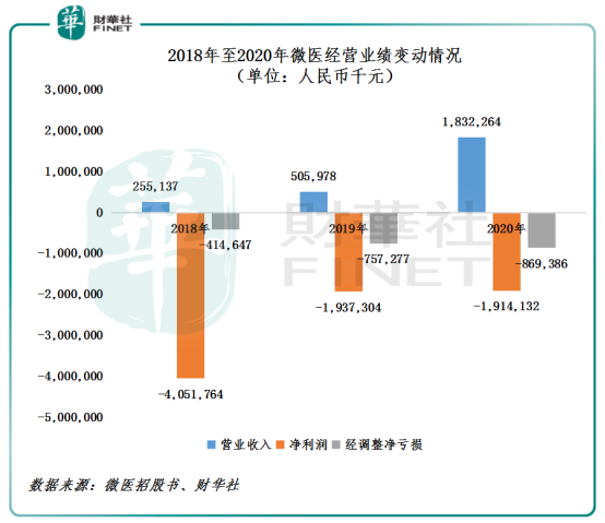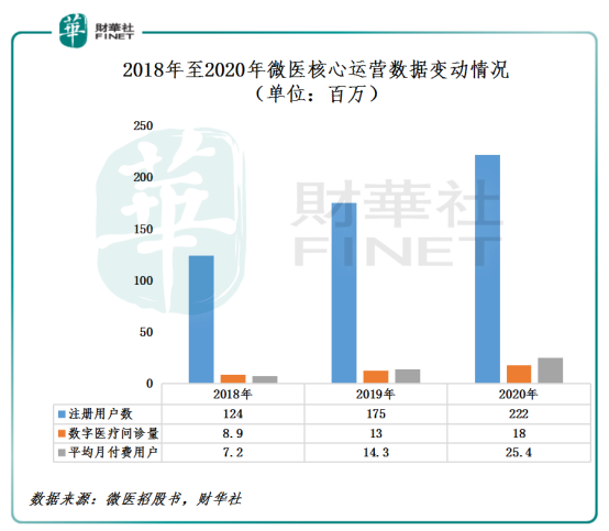 随着各项核心数据保持高双位数增长,微医营收规模出现倍增的情况。2018年、2019年及2020年,微医营业收入分别为2.55亿元、5.06亿元及18.32亿元,复合年增长率为168%。