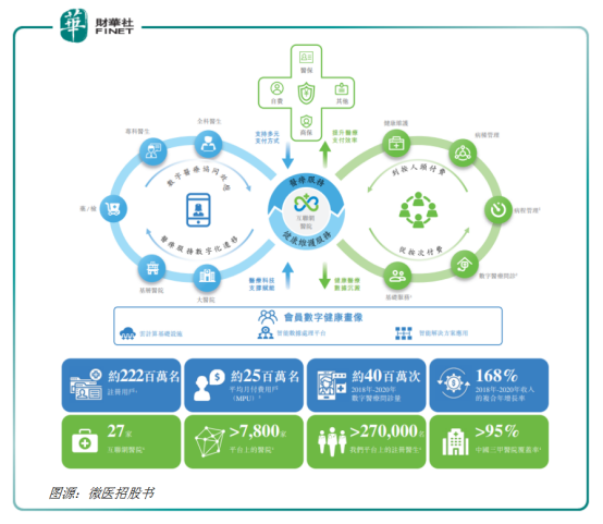 截至2020年12月31日,微医的平台连接了中国超过7,800家医院,包括95%以上的三级甲等医院以及超过270,000名注册医生。截至2021年3月23日,微医已经建立了27家互联网医院,其中17家互联网医院可通过公共医疗保险系统直接结算数字医疗服务的费用。