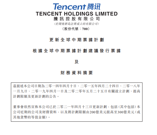 4月13日消息,腾讯控股在港交所公告,本公司已于二零二一年四月十三日更新中期票据计划,包括本公司近期的公司及财务资料,以及将计划限额由200亿美元提高至300亿美元。