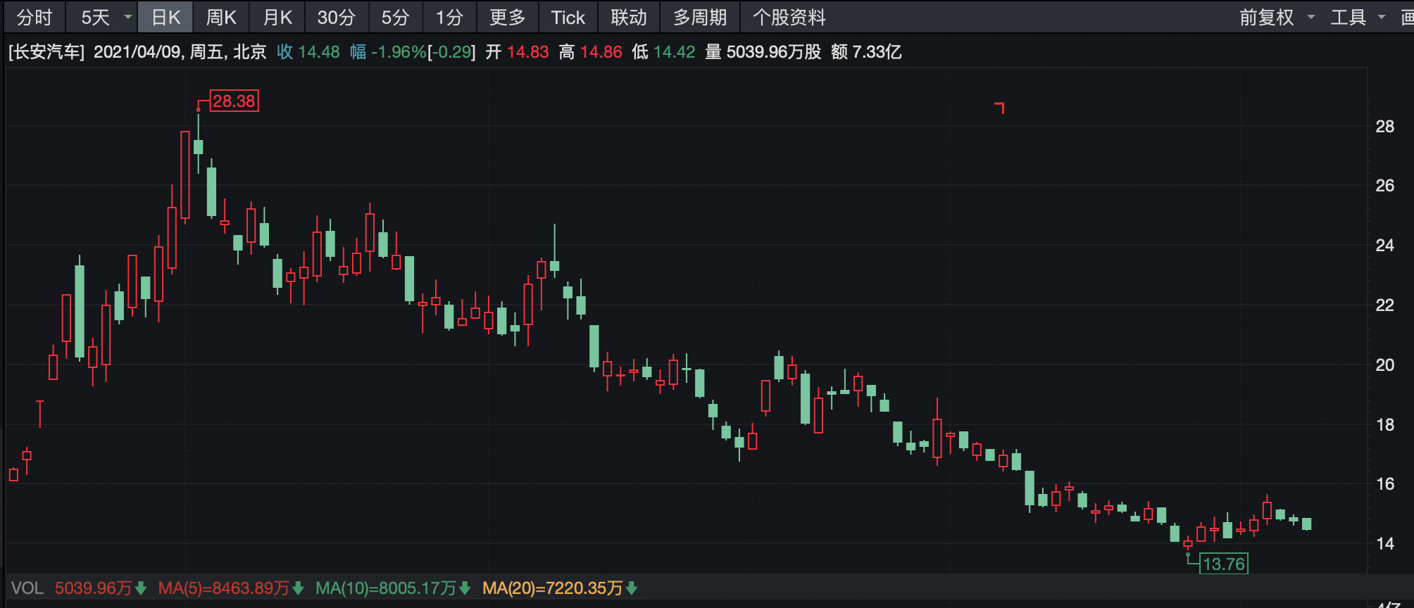 虽然长安汽车的数据比吉利汽车要好一点,但股价却表现一般。截至2021年4月9日,长安汽车收报14.48元/股,较1月26日的高点28.38元/股回落48.98%。