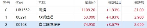 华盛资讯4月13日讯,港股啤酒板块普涨。截至发稿,青岛啤酒股份(00168)涨3.67%,报74.950港元;华润啤酒(00291)涨4.83%,报63港元。