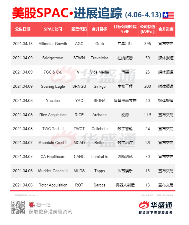 而与此同时,SPAC合并市场依旧热闹继续,“史上最大SPAC合并案”周二(4月13日)落地,“东南亚滴滴”Grab宣布,将通过与资产管理公司Altimeter Capital Management旗下的特殊目的收购公司(SPAC)Altimeter Growth Corp.(AGC.US)合并以实现上市,合并后Grab的估值为396亿美元。据Altimeter透露,由于投资者的浓厚兴趣,Grab的私募股权投资的规模有所扩大。