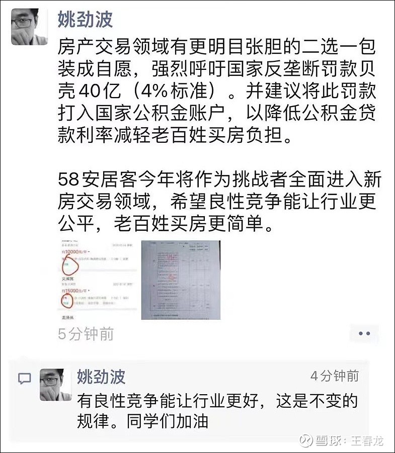 而就在阿里遭遇182亿罚款之后,58同城创始人兼CEO姚劲波则在社交媒体上突然发声,“房产交易领域有更明目张胆的二选一包装成自愿,强烈呼吁国家反垄断罚款贝壳40亿(4%标准)。并建议将此罚款打入国家公积金账户,以降低公积金贷款利率减轻老百姓买房负担”。