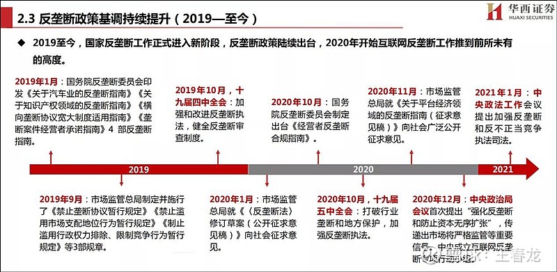 来自华西证券的分析显示,自从2019年至今,国家反垄断工作正式进入新阶段。反垄断政策陆续出台,2020年开始互联网反垄断工作推到前所未有的高度。