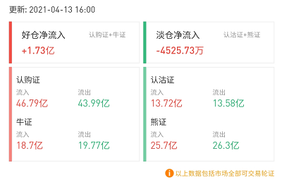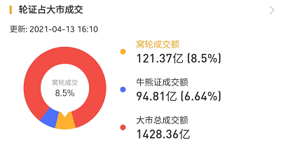 其中,窝轮总成交121.37亿港元,牛熊证总成交94.81亿港元。