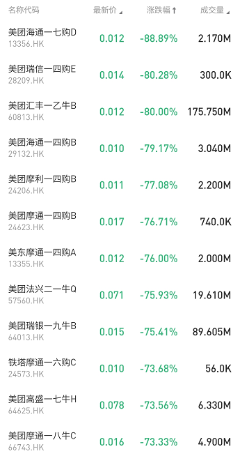在今日跌幅榜中,美团海通一七购D跌88.89%;美团瑞信一四购E跌80.28%。