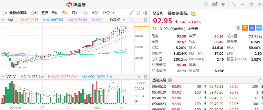 华盛资讯4月13日消息,美股盘初,曼格纳国际一度涨近6%,截至发稿涨幅收窄至3.87%,报92.95美元。今日有消息称其与LG电子的合资公司“非常接近”赢得苹果电动汽车项目。