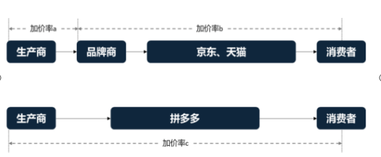 如下图所示,对于生产商来说,同样的商品拿到拼多多上销售,只要加价率c≥传统电商模式下的加价率a,那就代表厂商有利可图;同时,由于品牌溢价的消失,对消费者来说,就可以以更低的终端售价拿到心怡的商品,这就是M2C模式下流通链条缩短后带来的效率提升。