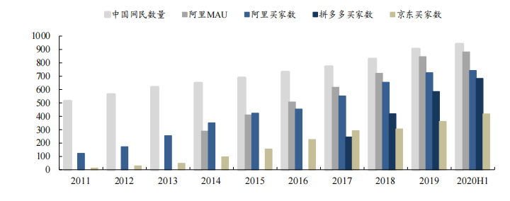 图11:中国网民数量和各平台买家数对比数据来源:东吴证券,36氪