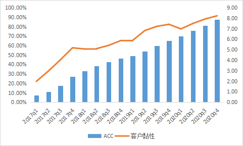 从用户规模看,2020年拼多多用户规模达到7.88亿,超越淘宝,成为全球用户数量最多的电商平台,同时,年内上线的拼小圈以及养成类小游戏都有效延长了用户停留时间,促进潜在用户的转化率,拼多多2020年的平均月活数达到7.19亿,致使用户粘性从88%提升至91.4%。