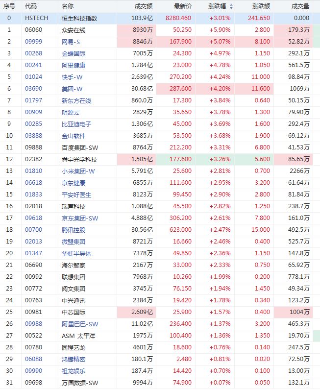 众安在线、网易涨超5%;快手-W涨超4%;百度集团-SW涨超3%;京东集团-SW涨超2%。