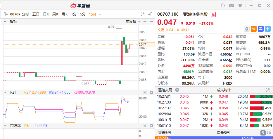 华盛资讯4月14日讯,亚洲电视控股(00707)近日与AI科创企业-睿洋图志订立非约束性战略框架合作协议。截止至发稿涨27.03%,报0.047港元,总市值4665亿港元。